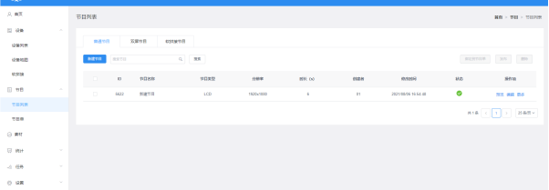 點擊【節目】,進入到節目列表,可對節目重命名、預覽、編輯、復制、發布、歷史記錄、節目創建者、修改時間等操作,如果節目比較多,可以在節目名稱后面的文本框輸入關鍵字,點擊“查詢”按鈕即可,圖3-1。圖3-1節目列表?ID:節目的ID;?節目類型:創建節目時選擇的設備類型;?節目名稱:創建節目的名稱;?分辨率:創建節目的模擬顯示屏的大小;?時長:節目總時長;?創建者:創建節目的用戶名稱;?修改時間:最后編輯節目的時間;?狀態:如果節目內容沒有暴力恐怖、色情違法或敏感詞匯,則為綠色圖標,AI一般可以審核通過;否則為紅色,需要人工再審核才能通過;?操作項:可對節目預覽、編輯、重命名、GPS定點播放、播控...
